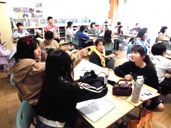 懇談会の間、一部の子供たちは、家庭学習をしたり映像を観たりして体育館で待ちました。