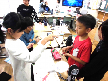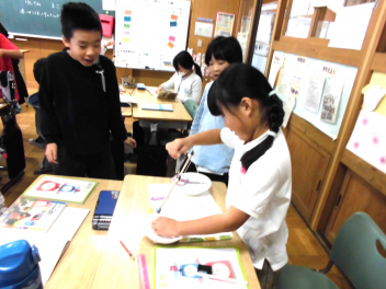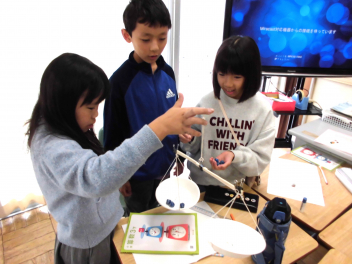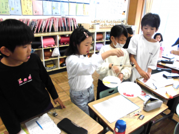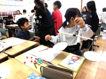 • 3年生は算数科で、「重さ」の学習をしています。今日は身の回りの物の重さを、およその見当をつけながら自作の天秤を使って測定していました。友達と協力して、重さ比べを楽しみました。