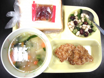 • 今日の給食は、「食パン、牛乳、いちごジャム、ささみカツ、豆サラダ、玄米入りスープ」でした。