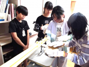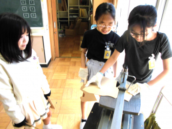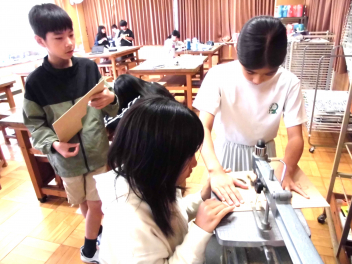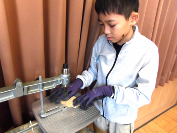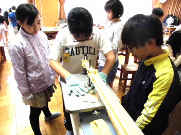 • 5年生は図画工作科「糸のこスイスイ」の学習で、電動糸のこぎりの安全な使い方を知り、合板を切り分けたい大きさ・形に切っていました。まだ、スイスイとまではいきませんが、ゆっくりと丁寧に糸のこで板を切ることができました。この後、板に色を塗ったり、板をつなげるための切れ込みを入れたり、さらに細かく板を切り分けたりして、作品を仕上げていきます。