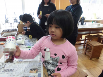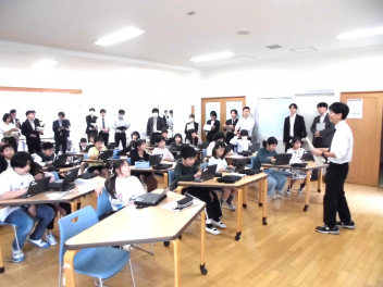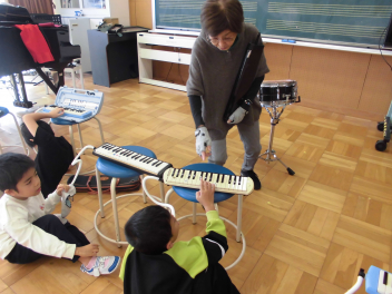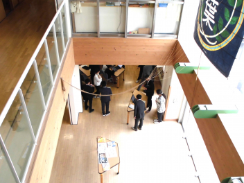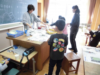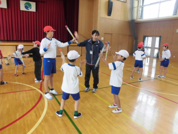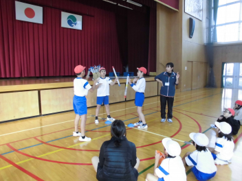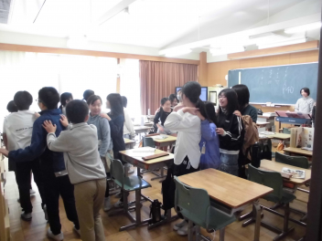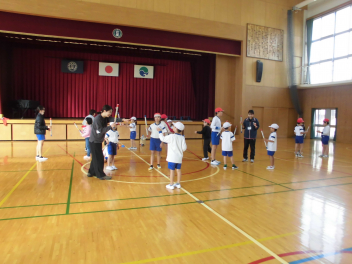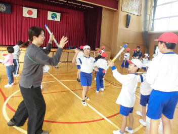 わかば学級の子供たちの自立活動の時間、新聞紙で作った棒を隣の友達に渡しながら、同時に反対側の隣の友達からの棒を受け取るというゲームに取り組みました。同時に2つのことをするというのはとても難しいことですが「せーのっ!」と掛け声を合わせて投げると、だんだん息が合って棒を落とさずに受け渡しができるようになりました。スピードを速くしたり、投げ合う人を増やしたり、離れたところから渡したりと、少しずつレベルを上げていきました。ゲームのグループは10月に行ったわかば学級のお店屋さんや校外学習での仲良しグループの仲間たちでした。行動を共にした仲間たちとのゲームはより楽しかったことと思います。