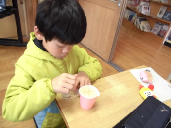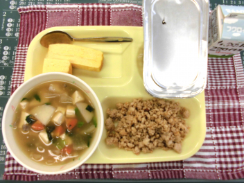 • 今日の給食は、「ごはん、牛乳、鶏そぼろごはん、厚焼卵、のっぺい汁」でした。