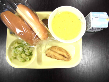 • 今日の給食は、「ロールパン、牛乳、あじのカレー揚げ、サワ―キャベツ、にんじんポタージュ」でした。