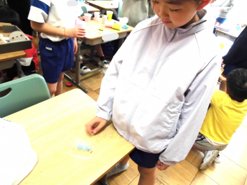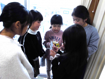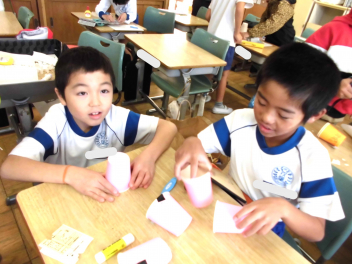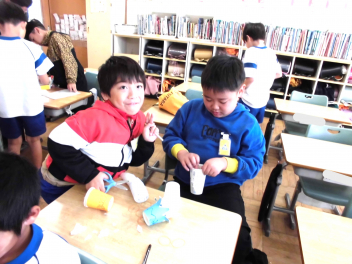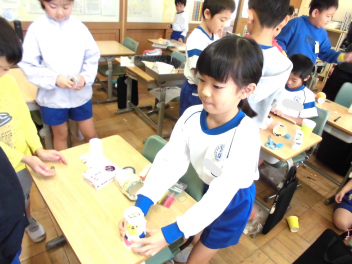 • 2年生は、生活科「おもちゃ図かん~動くおもちゃを作ってみんなであそぼう~」の学習で、『ぴょんコップ』『とことこ車』『パッチンジャンプ』『ころころころん』『ヨットカー』『めいろ』など、動くおもちゃを作って楽しみました。「もっと、よく動くようにするためには・・・」「もっと高く飛ばすためには・・・」子供たちは、友達と話し合い、試行錯誤しながら工夫しておもちゃを完成させました。