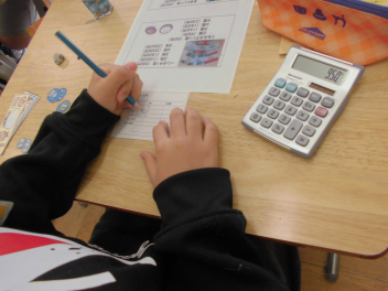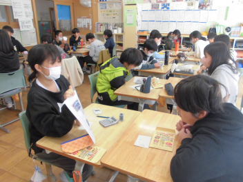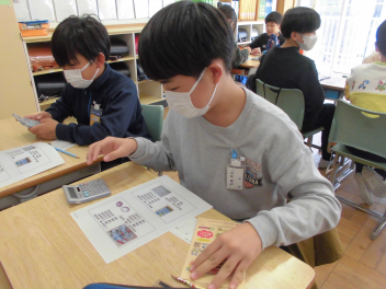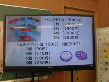計算機を使って何度も確認する児童、伝票に書いて注文個数を確認する児童、商品の値段表を見ながら確認する児童など、多くの児童が初めての経験に戸惑っていました。「どうしたらより良くできるのか・・・・・。」互いにアドバイスしている姿もありました。『気づき・考え、行動する』を実践しています。