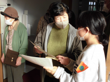 いよいよ、「模擬販売」開始です。チラシ員たちもお客様役の地域の方に声を掛け、チラシを渡しながらKCB(キッズチャレンジビジネス)への興味関心を引くための呼び掛けができていました。