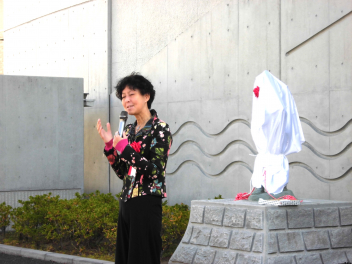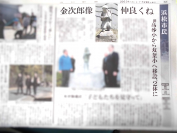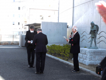 双葉小学校は、旧南小学校と旧高砂小学校が一緒になってできた学校だということを、多くの皆さんが知っていると思います。これまで双葉小学校にあった石像は、旧南小学校のものでした。この度、旧高砂小学校の場所に大学ができることになり、そこにあった金次郎さんの石像を運んできて、双葉小学校に置くことになりました。つまり、双葉小学校には、2体の石像が置かれるということです。これは、全国的にとても珍しいそうです。2体の石像が並ぶことは、学校の名前「ふたば」に相応しいように思います。2体の石像を「なかよし金次郎像」と名前を付け、これから双葉小学校の自慢の一つとして大切にしていければと思います。