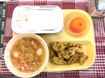 • 今日の給食は、「ごはん、牛乳、中華飯、のりポテト、みかん」でした。