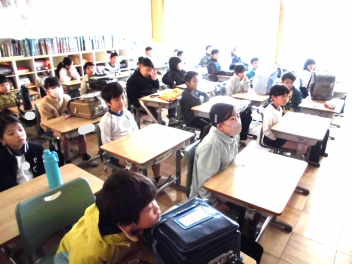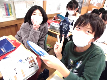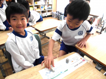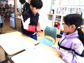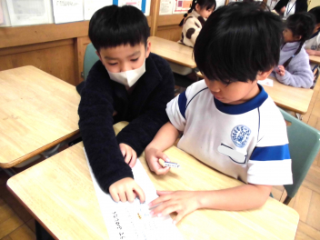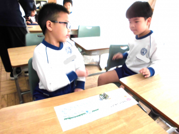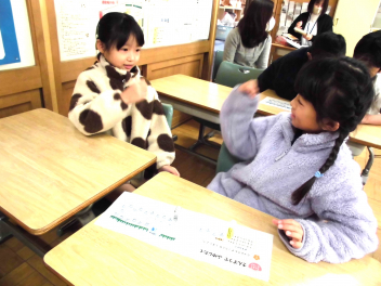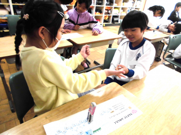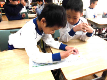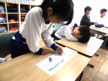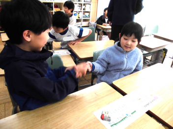 • 1年生は、算数科「さんすうで ふゆじたく」の学習で、席が隣の友達と『じゃんけん すごろく』をしていました。『じゃんけん すごろく』は、学習してきた、たし算やひき算が取り入れられていて、じゃんけんで勝った子が計算をしてこまを進めていき、遊びながら学べるゲームです。子供たちは、学んだことを活かしながら、楽しく活動していました。