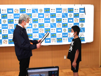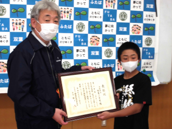 • 昼の放送終了後にオンラインで、「赤い羽根募金」の表彰を行いました。双葉小学校では、運営委員会が主体となり、毎年「赤い羽根募金」の活動を行っています。その活動の功績が認められ、浜松市社会福祉協議会の方から感謝状をいただきました。運営委員会の委員長が代表で、感謝状を受け取りました。