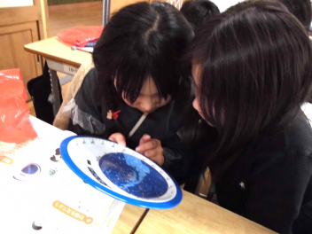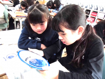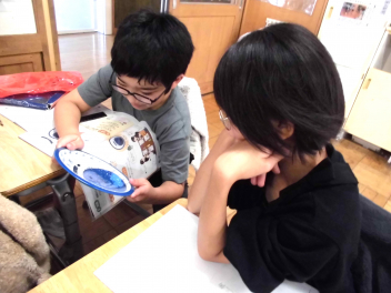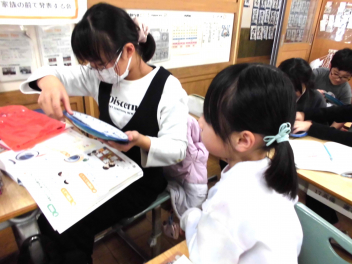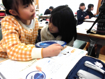 • 4年理科「星や月~月と星の位置の変化~」の学習では、子供たちが『星座早見』を使う練習をしていました。『星座早見』は、特定の場所と時刻に合わせ、そのとき見える星空を教えてくれる便利な道具です。内側の星図盤と外側の時刻盤からできています。子供たちは隣の席の友達と協力し、今日の夜に見える星座を『星座早見』で調べました。