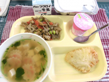 今日は、ごはんに、ちらしごはんの具を混ぜていただきました。また、デザートは甘くて美味しい「ももゼリー」でした。