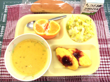 今日の給食は、「ロールパン、牛乳、オムレツ、白菜のコールスロー、にんじんポタージュ」でした。