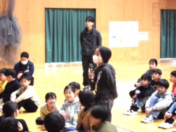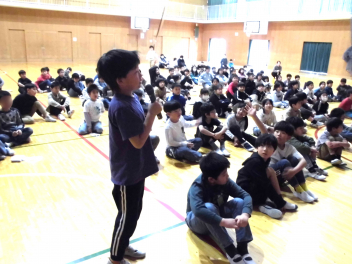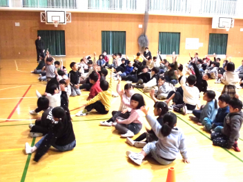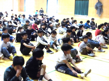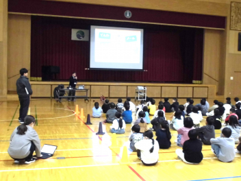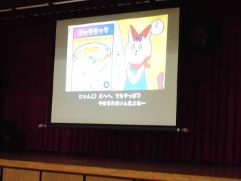 • 1~3年生は、2校時に体育館で、「情報モラル講座」を行いました。情報モラル講座認定講師の方から、インターネットやSNSの危険について教えていただきました。また、アニメ動画の視聴を通して、インターネットやSNSなどの安全で楽しい使い方について考えました。