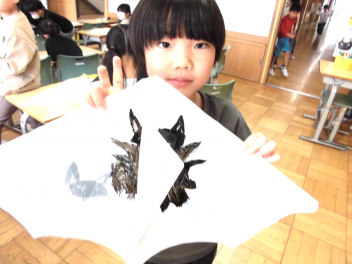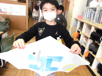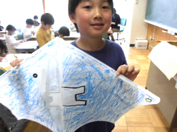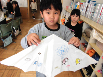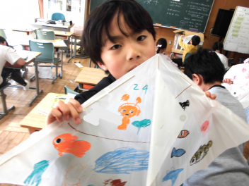• 1年生は、生活科のまとめの学習で、凧作りを楽しんでいました。