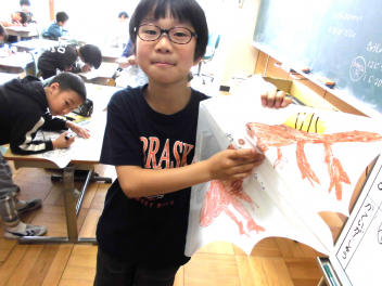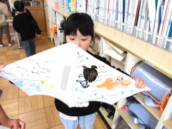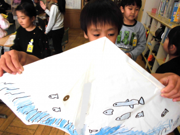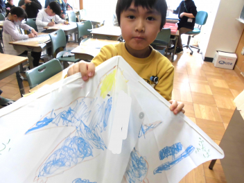 今日はペンで、凧に色付けをしました。人気のキャラクター、恐竜を描く子もいて、お気に入りの凧が完成したようです。