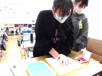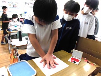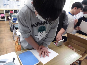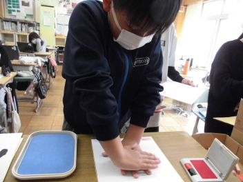 色紙には、消しゴムで作った落款を押印し、手のひらにインクを付けて手形を押します。