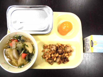 今日の給食は、「ごはん、牛乳、ふかと大豆の甘辛和え、七草すいとん汁、みかん」で、七草の行事食でした。