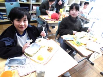 日本には、1 月7日に七草粥を食べる風習があります。1年間、元気に過ごせるようにと願いを込め、栄養価の高い春の七草と呼ばれる「せり・なずな・ごぎょう・はこべら・ほとけのざ・すずな・すずしろ」を入れたお粥を食べます。お正月に御馳走を食べ過ぎるため、胃や腸を休ませてあげるという意味もあります。今日の給食では、七草の中のすずしろ(だいこん)など、野菜がたくさん入った汁物となって出されました。