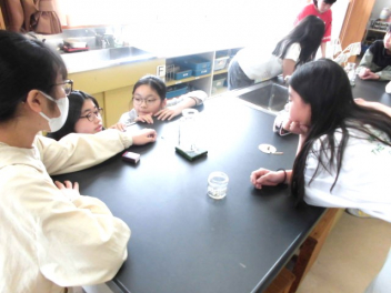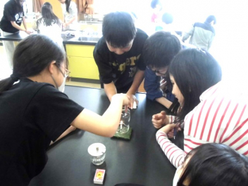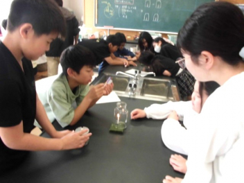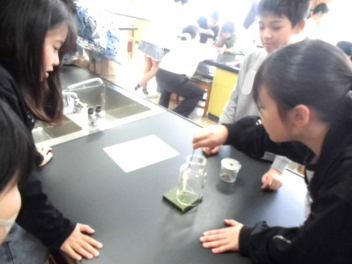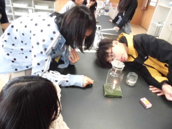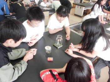 • 6年生が、理科「ものの燃え方」の学習で、燃焼の仕組みを調べるために理科室で実験をしていました。