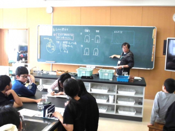 火のついたろうそくを底なし集気瓶の中に入れ、底なし集気瓶の底の隙間に火のついた線香を近付けました。すると、その隙間から線香の煙が勢いよく吸い込まれていきました。子供たちは、「どうやら物が燃え続けるために、空気が出入りしているのではないか・・・・・。」と実験結果から予想しました。次時は、その予想を確かめる実験をするそうです。