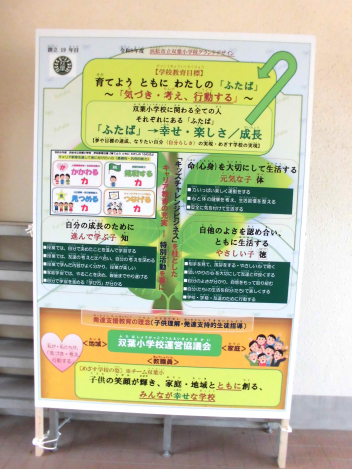 双葉小学校の取組について保護者・地域の皆様に理解を深めていただけるよう、令和8年度双葉小学校の経営方針が分かる「グランドデザイン」図を拡大した看板を作り、児童昇降口前に設置しました。