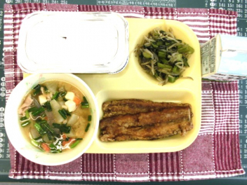 • 今日の給食は、「ごはん、牛乳、さんまの蒲焼、もやし炒め、豚汁」でした。