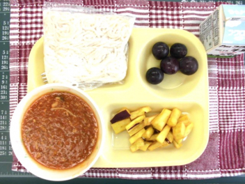 • 今日の給食は、「ソフト麺、牛乳、きのこソース、さつまいもの素揚げ、ぶどう(巨峰)」でした。