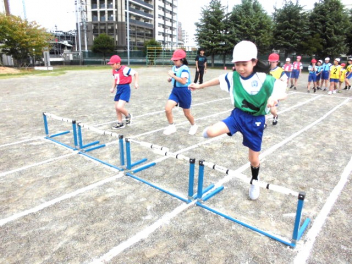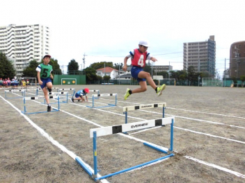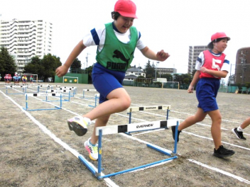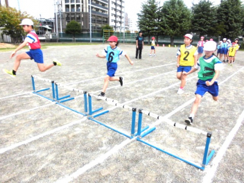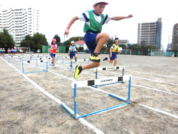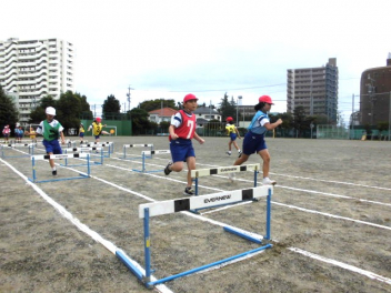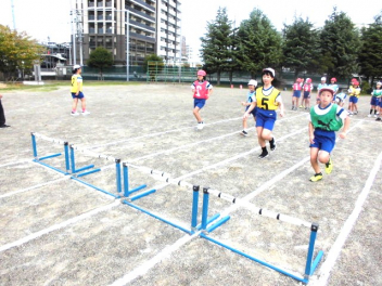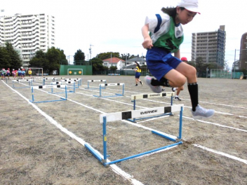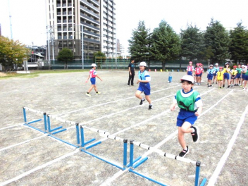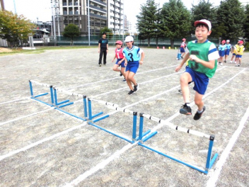 • 4年生は、体育科「ハードル走」の学習を始めました。今日は、ハードル間のインターバルが異なるコースを4つ作り、どのコースが自分に合っているのか、走って跳び比べをしました。スピードを上げると、インターバルが短すぎると跳びにくいですね。3歩でリズミカルにハードルを走り越せるよう練習していきましょう。