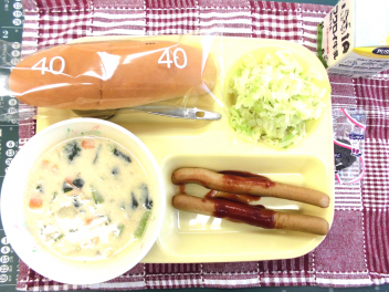 • 今日の給食は、「ロールパン、牛乳、ウインナーソーセージ、ボイルキャベツ、ほうれんそうのクリームスープ、プルーン」でした。