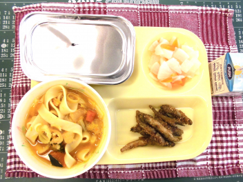 • 今日の給食は、「ごはん、牛乳、わかさぎの胡麻だれかけ、かぼちゃのほうとう、ゆずだいこん」でした。