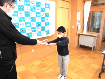 スマイルがんばり賞(学年別読書目標冊数を達成した子)、おすすめの本どくは賞(学年別お勧めの本を読破した子)の表彰です。今日も多くの子が表彰されました。
