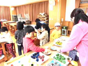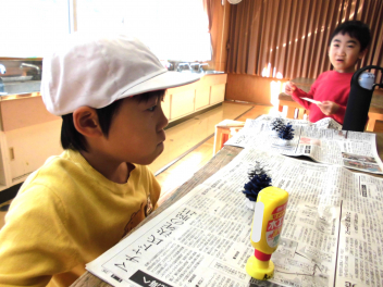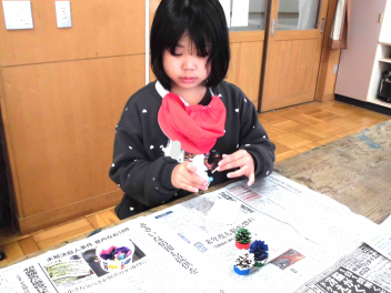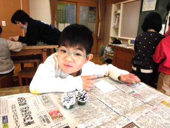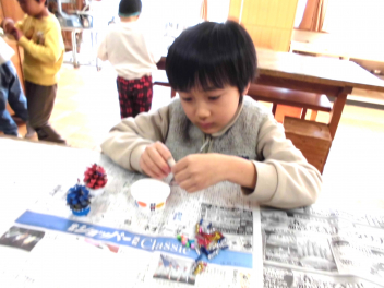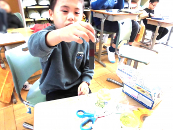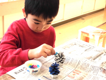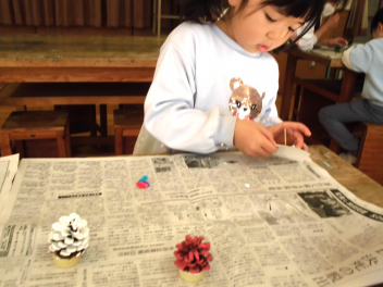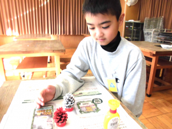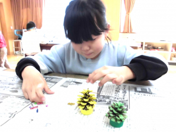 • わかば学級の1年生たちが図工室で、松ぼっくりを使ってミニクリスマスツリーづくりをしていました。学校にプレゼントして、校内のいろいろなところに飾ってもらえるよう、頑張っていました。カラフルなツリーの完成です。