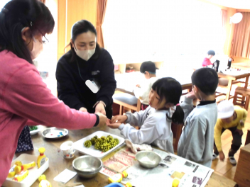 今日は、「冬至」の行事食でした。「冬至」は、一年の中で一番昼が短く、夜が長い日です。「冬至」にかぼちゃを食べたり、ゆず湯に入ったりすると、風邪をひかないと言われています。今日は、味噌味の汁の中に、かぼちゃと山梨県特産品の「ほうとう」と呼ばれる麺が入っていました。温かい汁物は、体を内側から温めてくれます。また、ゆずだいこんの味付けには、ゆずを絞った果汁が入っていました。
