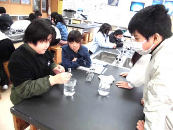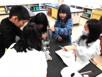 • 4年理科「ものの温度と体積」の学習では子供たちが、空気の温度の変化と体積の変化を関係付け、予想を立てて実験をしていました。実験の結果、予想通り、空気の温度が上がると体積が大きくなり、温度が下がると体積が小さくなりました。