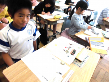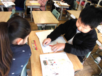 • 2年国語科「冬がいっぱい」の学習では子供たちが、自分が冬と感じる『もの』をそれぞれに選び、自分の経験と結び付けて友達に紹介する文章をカードに書いていました。柚子湯、雪合戦、布団、おでんなどなど、自分らしさが表れた『もの』を選び、楽しくカードづくりをしました。