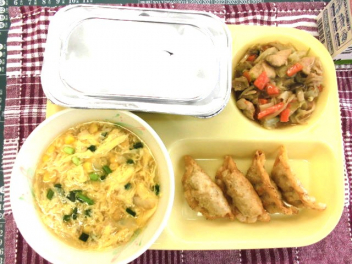 • 今日の給食は、「ごはん、牛乳、鶏肉と野菜の中華炒め、揚げ餃子、スーミータン」でした。