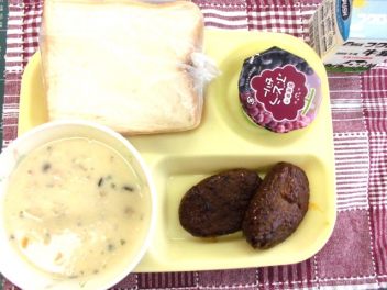 • 今日の給食は、「食パン、牛乳、煮込みハンバーグ、きのこのクリームスープ、ぶどうゼリー」でした。