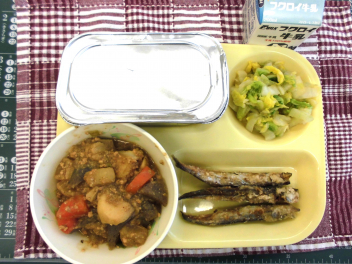 • 今日の給食は、「ごはん、牛乳、ししゃもの唐揚げ、胡麻味噌煮、白菜の浅漬け」でした。