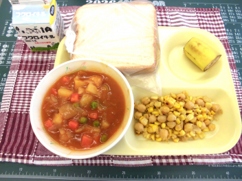 今日の給食は、「食パン、牛乳、ミートボールシチュー、コーンとひよこ豆のソテー、バナナ」でした。