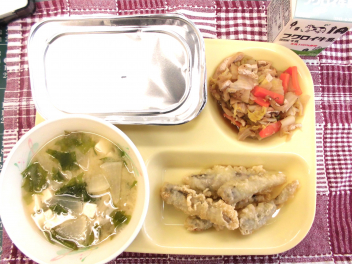 今日の給食は、「ごはん、牛乳、めひかりの天ぷら、煮びたし、味噌汁」でした。