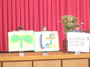 こうした「ふたば」への願いや思いを大切にしたい・・・今年度、新たに学校の目標を変えることにしました。学校教育目標は、『育てよう ともに わたしの「ふたば」』です。目標の中の「ふたば」という言葉には、「仲良く、楽しく、幸せ、成長」という意味を込めています。自分で、自分たちで、「ともに」幸せや楽しさを創って成長していきましょうという目標です。