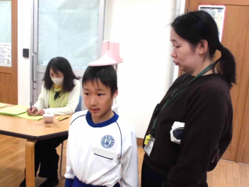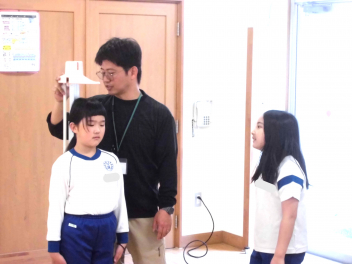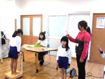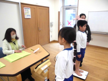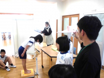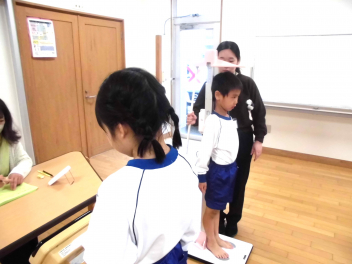 計測の前に養護の先生から保健室の利用の仕方や身長・体重の計測方法の説明を受けた後、身長・体重を計測し、養護教諭が側弯の検査を行いました。