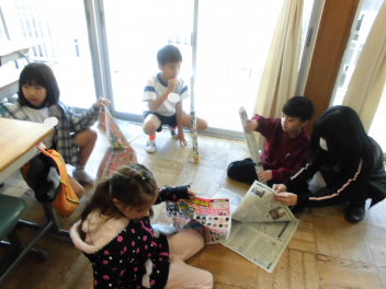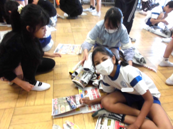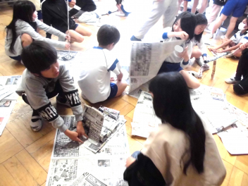 • 4年生の子供たちが、グループ対抗「新聞紙タワーゲーム」に挑戦していました。新聞紙を積み上げるシンプルなゲームですが、盛り上がりやすくていいですよね。