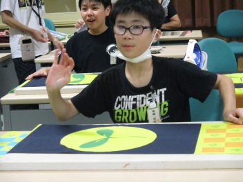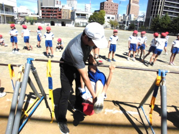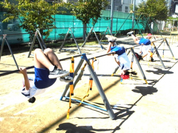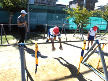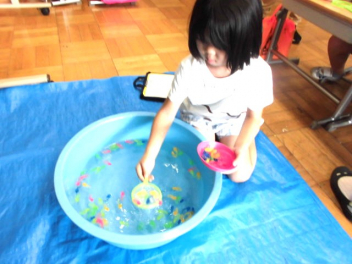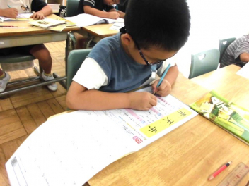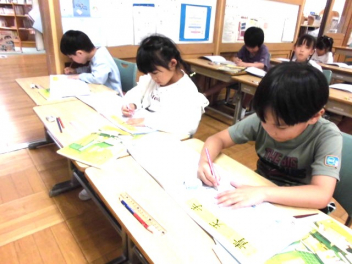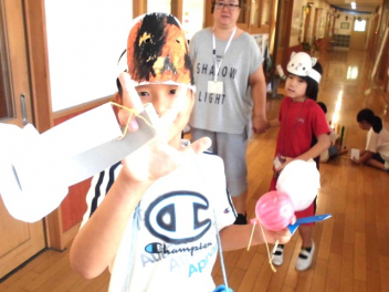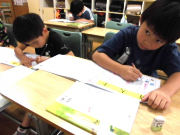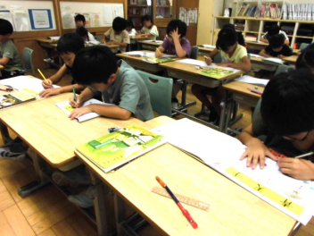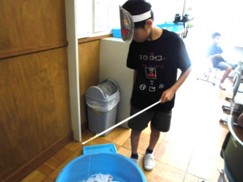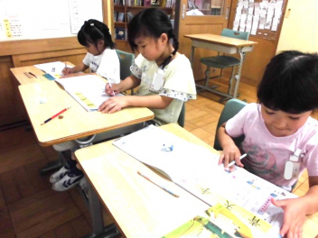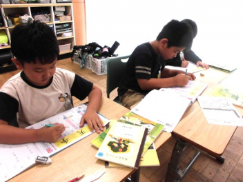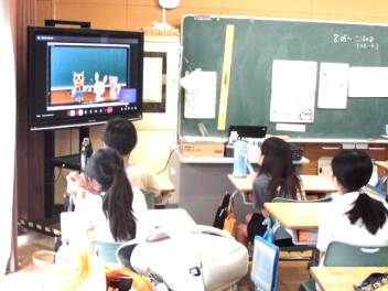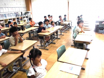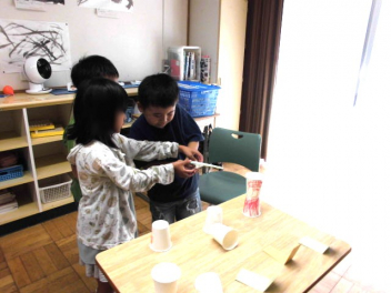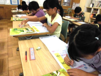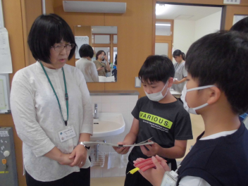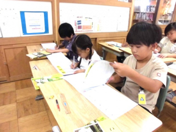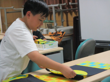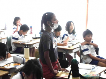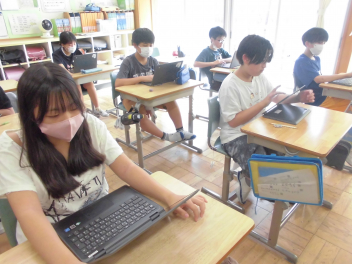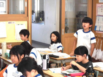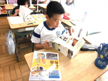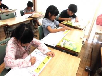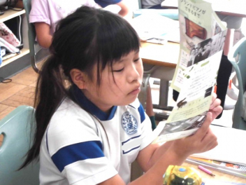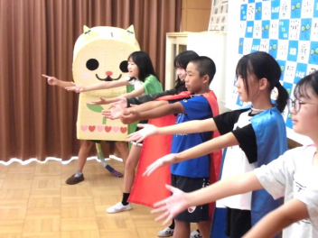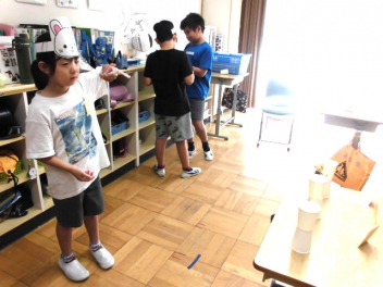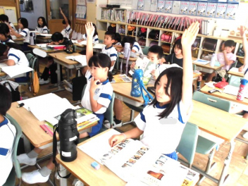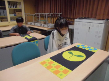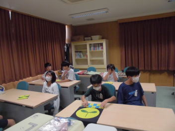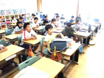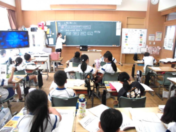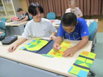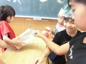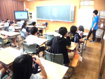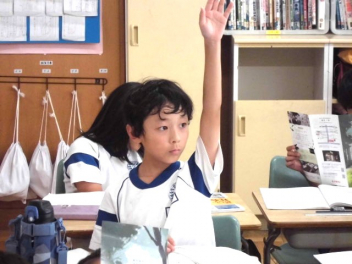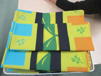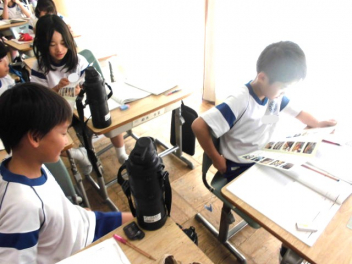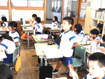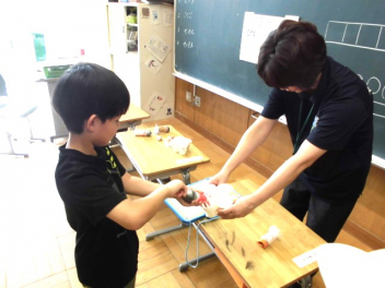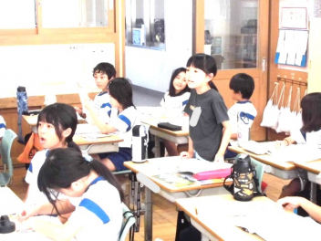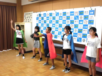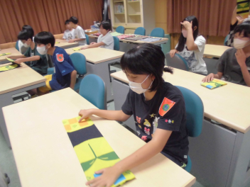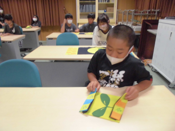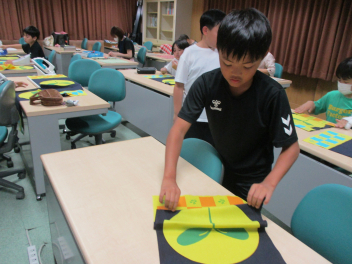 本日のかがやき(総合的な学習の時間)では、「手ぬぐいのたたみ方を工夫してお客様に喜んでもらおう。」と子供たち全員で、手ぬぐいをたたんでいました。「柄が見えるようにしたいね。」「注染染めの良さを知ってもらいたいね。」「色の綺麗さが伝わるといいな。」と、子供たちは試行錯誤しながら取り組みました。