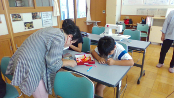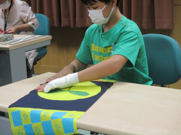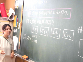5校時は、商品をアピールするために、みんなで製作した商品の良さを出し合う活動をしました。「手ぬぐいは手触りがよく、生地がとてもふわふわしています。手を拭くだけでなく、インテリアやペットボトルカバーとしても活用できます。」「くるみボタンはSDG’sを考えて、生地の切れ端も再利用しています。ブローチやアクセサリー、マグネットなどにして活用することができます。」・・・・・一人一人が真剣に商品の良さを考えていました。