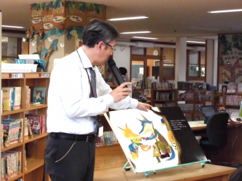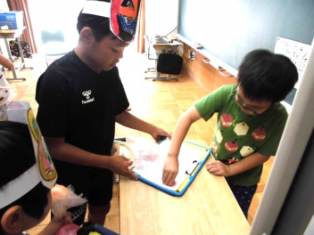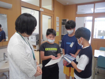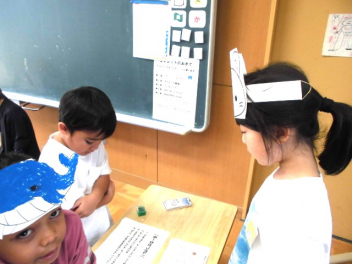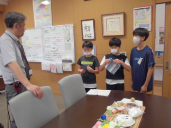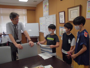 以前、みんなで出し合った商品の値段について、『営業部』の子供たちが数日前から話合いを重ねていました。校長先生と教頭先生にも相談してみようということになり、値段について話しに行きました。