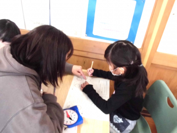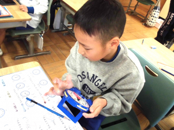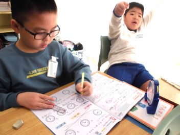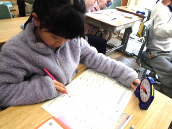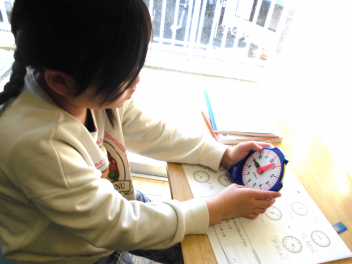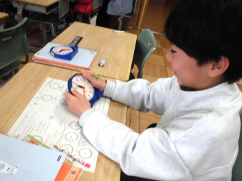 • 1年生は、算数科「なんじ なんぷん」の学習で、時計模型を使いながら「何時何分」の時刻の読み方を練習していました。生活に欠かせない時計の読み方・・・特訓中です。