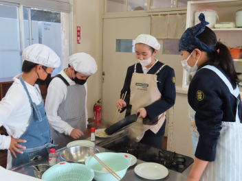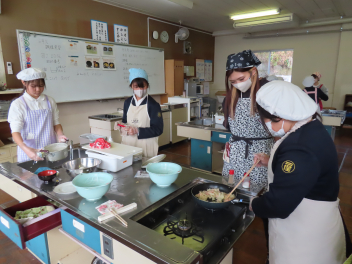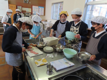 6年生が家庭科の学習で調理実習を行い、ジャーマンポテトとスクランブルエッグを作りました。グループで協力して手際よく調理を進めていました。保護者ボランティアの皆さんに、アドバイスやお手伝いをしていただいたおかげで、大変助かりました。ありがとうございました。
