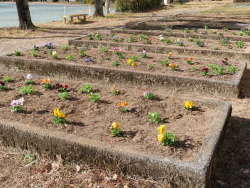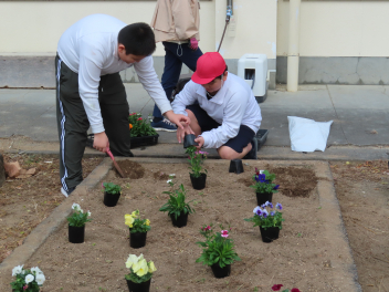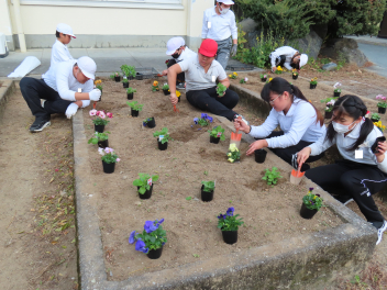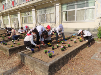 先日の昼休みに、園芸委員会の子供たちが花壇にパンジー、ビオラなどの花の苗を植えてくれました。